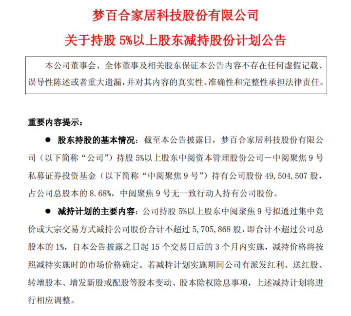 12月12日,梦百合(603313.SH)发布公告,公司持股5%以上股东中阅聚焦9号拟通过集中竞价或大宗交易方式减持公司股份合计不超过570.59万股,即合计不超过公司总股本的1%。